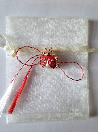 Broche in de vorm van een lieveheersbeestje met een (nep) pareltje als lijfje